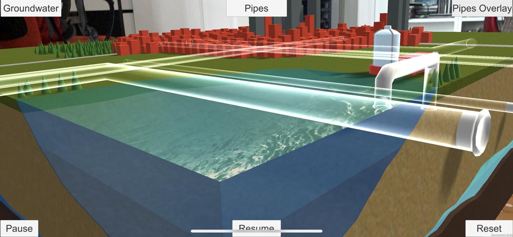 Virtual reality and AR tools are being increasingly developed in all kinds of disciplines, making it possible to “look inside” otherwise hidden structures and processes. In geosciences, available products include 3D data visualisations or the superimposition of interpolated information to surface views; however, no dedicated tool is available for groundwater visualisation. Most user-facing mobile applications by utility companies address consumption/ billing or provide general information on water quality or outlet location. This AR visualisation will go beyond the state-of-art by providing both a location-based look into underground processes, as well as an innovative table-top view that can be used anywhere.
